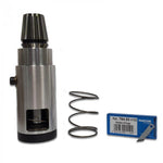 The nose riding system consists of two steel cylinders. One with an external thread, the other with an internal thread. Turning one cylinder on top of the other allows for a very precise depth calibration. A locking ring is also included to lock the setting in place so machine vibrations do not affect the cut quality or depth. The system also entirely encloses the tooling for safety as well as superior chip removal.